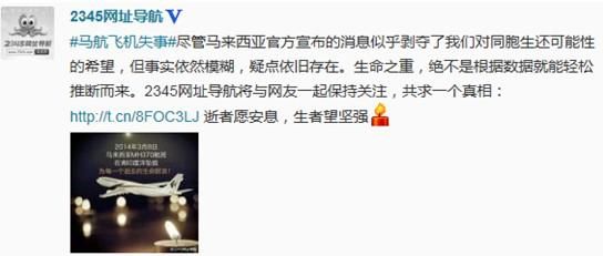 此外,網站右側醒目的馬航MH370專題依舊在保持最新消息的實時更新。2345網址導航官方微博今日將頭像換為灰色,并發布微博表示:“盡管馬來西亞官方宣布的消息似乎剝奪了我們對同胞生還可能性的希望,但事實依然模糊,疑點依舊存在。生命之重,絕不是根據數據就能輕松推斷而來。2345網址導航將與網友一起保持關注,共求一個真相。”