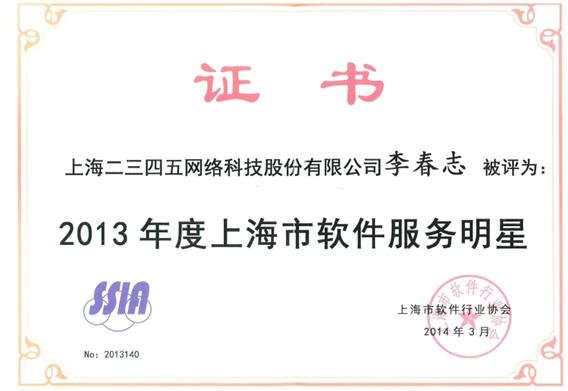 2014年3月26日下午,上海市軟件行業協會2014年工作年會暨“上海市軟件行業標兵&軟件行業服務明星”評選活動頒獎典禮在上海市經濟管理干部學院禮堂舉行。上海市經信委、科委、發改委、商務委等相關部門負責人,相關產業園區(基地)、行業協會、軟件企業負責人及十余家媒體記者,約300人到會。本次評選活動中二三四五董事長龐升東獲得軟件行業標兵稱號,二三四五軟件研發中心李春志獲得軟件服務明星稱號。