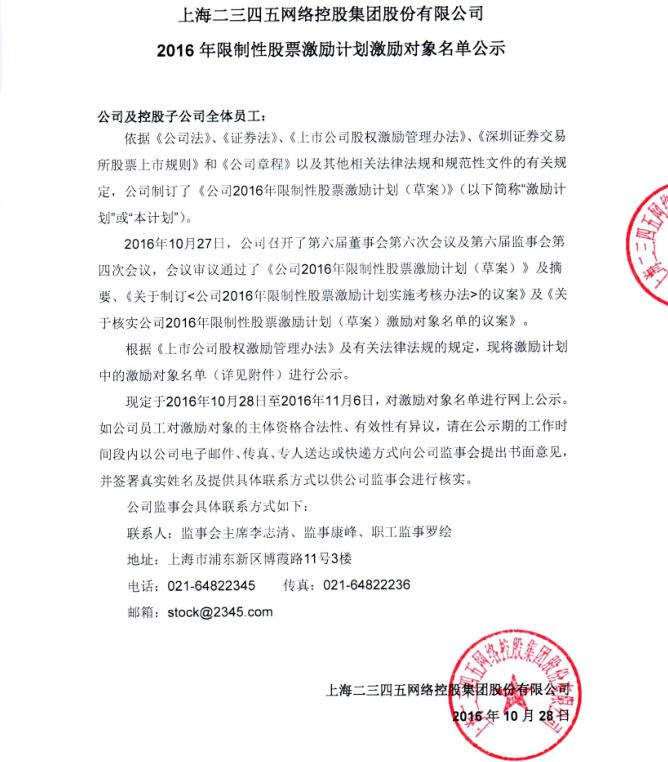 2016年限制性股票激勵計劃激勵對象名單公示的通知