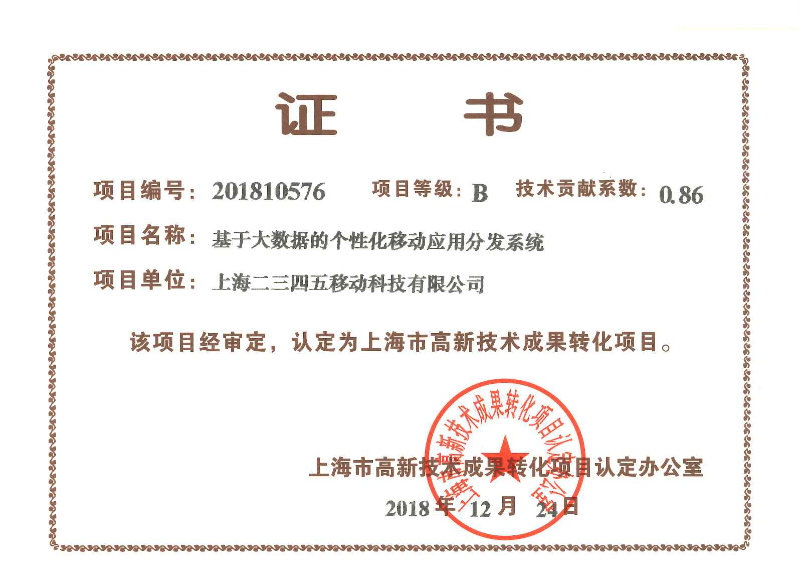 近日,上海互聯網巨頭、中國互聯網百強企業二三四五,再獲兩項上海市高新技術成果轉化認證,分別為上海二三四五網絡科技有限公司的“基于人工智能算法的精準營銷系統”和上海二三四五移動科技有限公司的“基于大數據的個性化移動應用分發系統”。本次公布的上海高新技術轉化成果認證的企業還包括中國石化在內的其他共計70個項目。