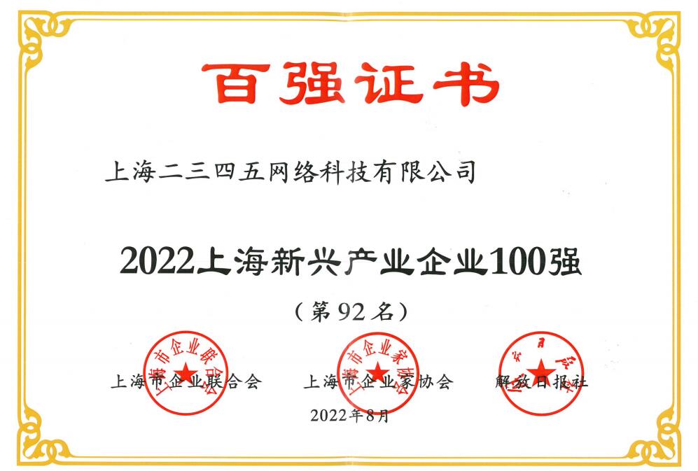 2022年8月30日下午,上海市企業(yè)聯(lián)合會、上海市企業(yè)家協(xié)會、上海市經(jīng)濟(jì)團(tuán)體聯(lián)合會和解放日報社聯(lián)合召開2022上海百強(qiáng)企業(yè)新聞發(fā)布會。上海二三四五網(wǎng)絡(luò)控股集團(tuán)股份有限公司榮登“上海民營服務(wù)業(yè)企業(yè)百強(qiáng)”,位列76名;上海二三四五網(wǎng)絡(luò)科技有限公司榮登“上海新興產(chǎn)業(yè)企業(yè)百強(qiáng)”,位列92位。